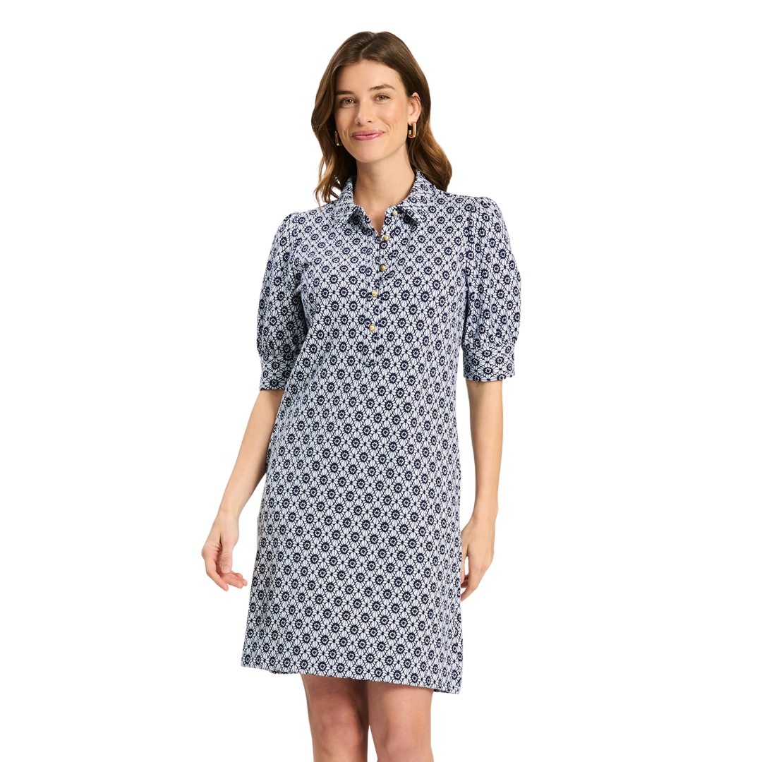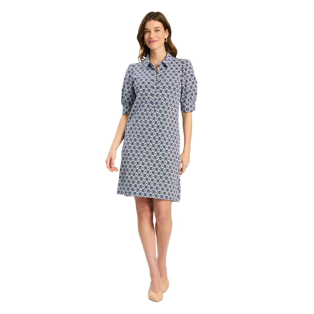 A spring refresh of a customer-favorite Knit Girl. Alicia features a collared neckline, gold buttons, and puff sleeves—perfect for day-to-night and travel. Featured here in our exclusive Stain Glass pattern.