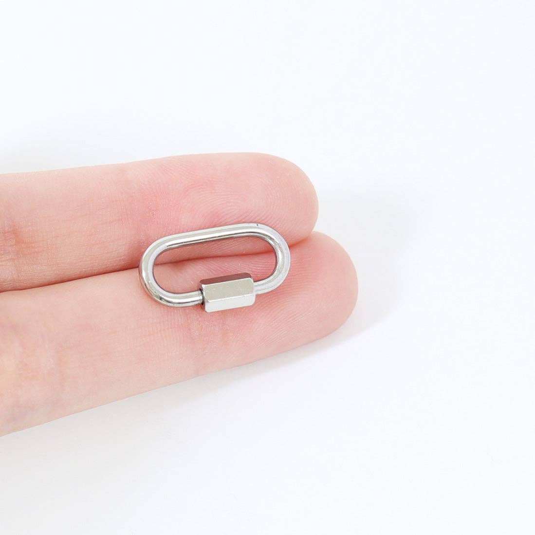 The Stainless Steel Classic Carabiner Charm Clasp features a polished finish made of 316L stainless steel with an easy-to-open, twisting center piece to open and close.