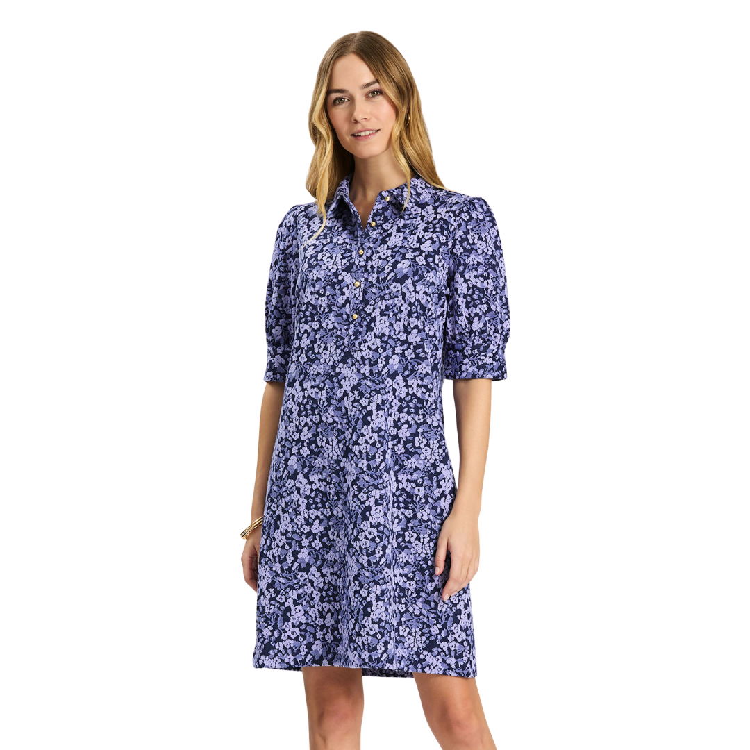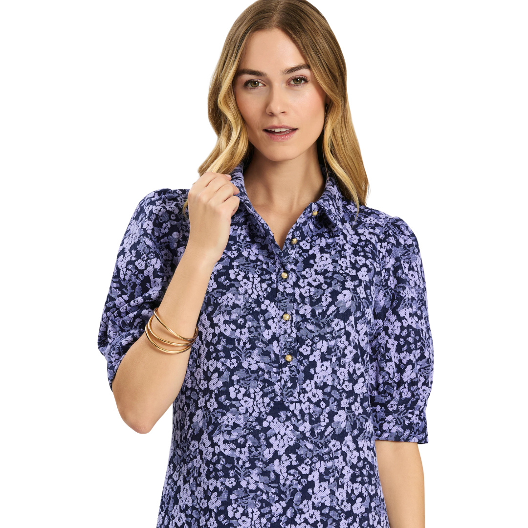 A spring refresh of a customer-favorite Knit Girl. Alicia features a collared neckline, gold buttons, and puff sleeves—perfect for day-to-night and travel. Featured here in our exclusive Cherry Blossoms pattern.