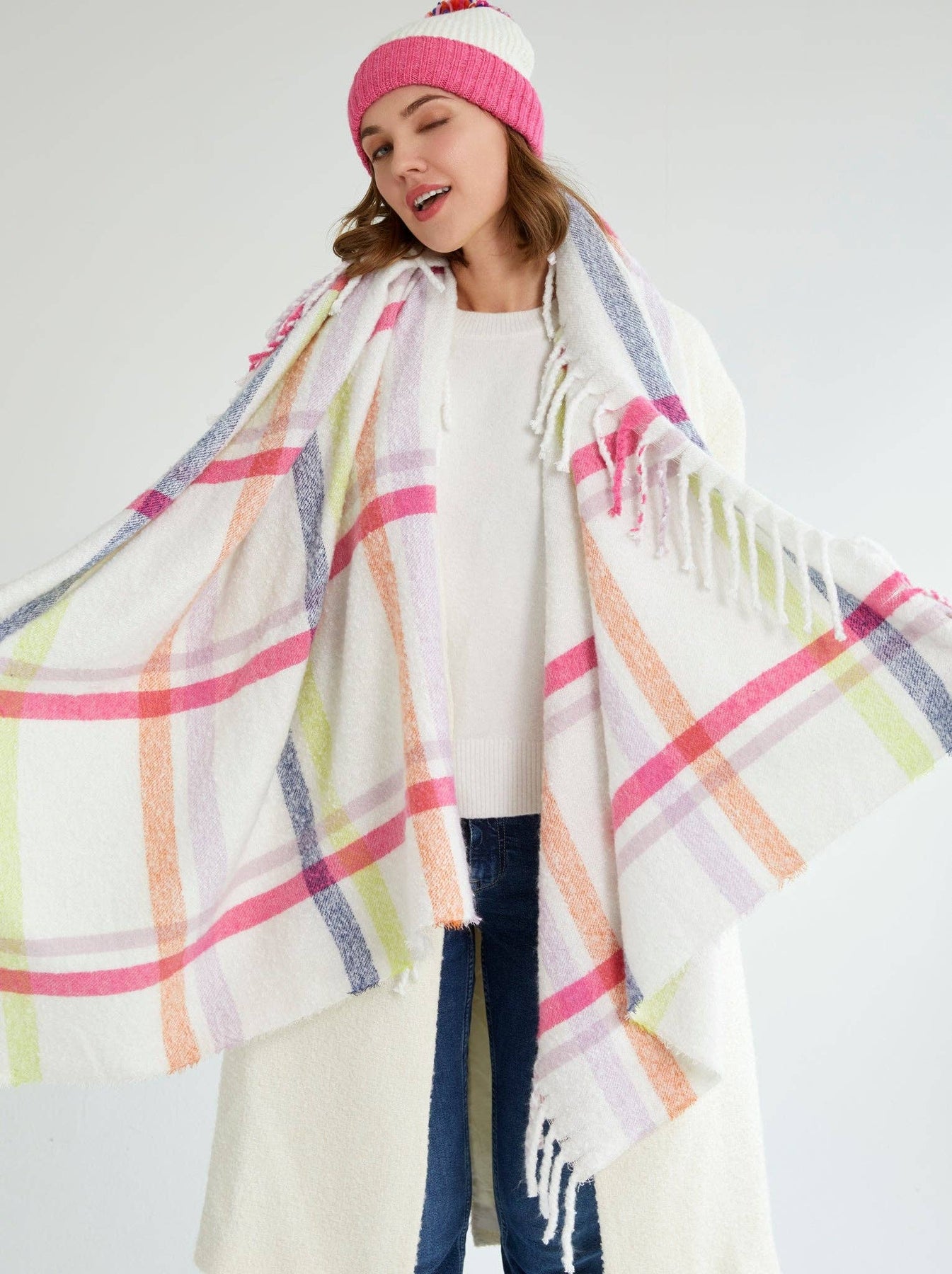 Add a pop of color to your winter wardrobe in Shiraleah's Lilou Scarf. This scarf features a plaid print with a mix of white, blue, magenta and lime green with a fringe trim, giving this classic silhouette a lively update. Made from polyester, the Lilou Scarf is sure to keep you cozy while brightening up any dull winter day.