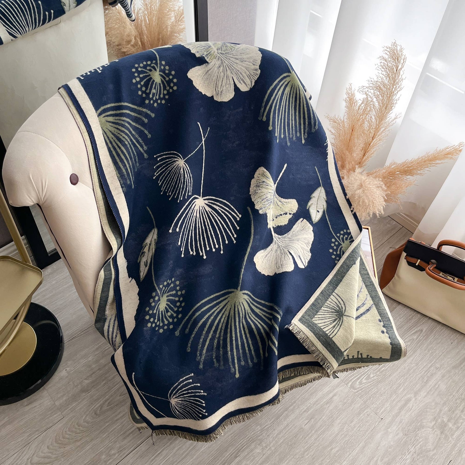 This one size fits all reversible wrap, drapes over and accents any outfit, casual or dressy. It feels and looks like cashmere. A beautiful layering piece! 55% Poly, 45% Viscose.
