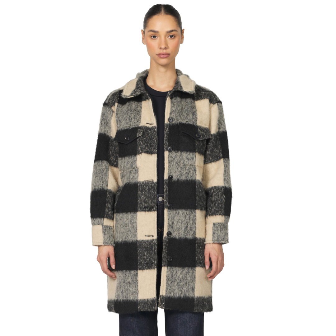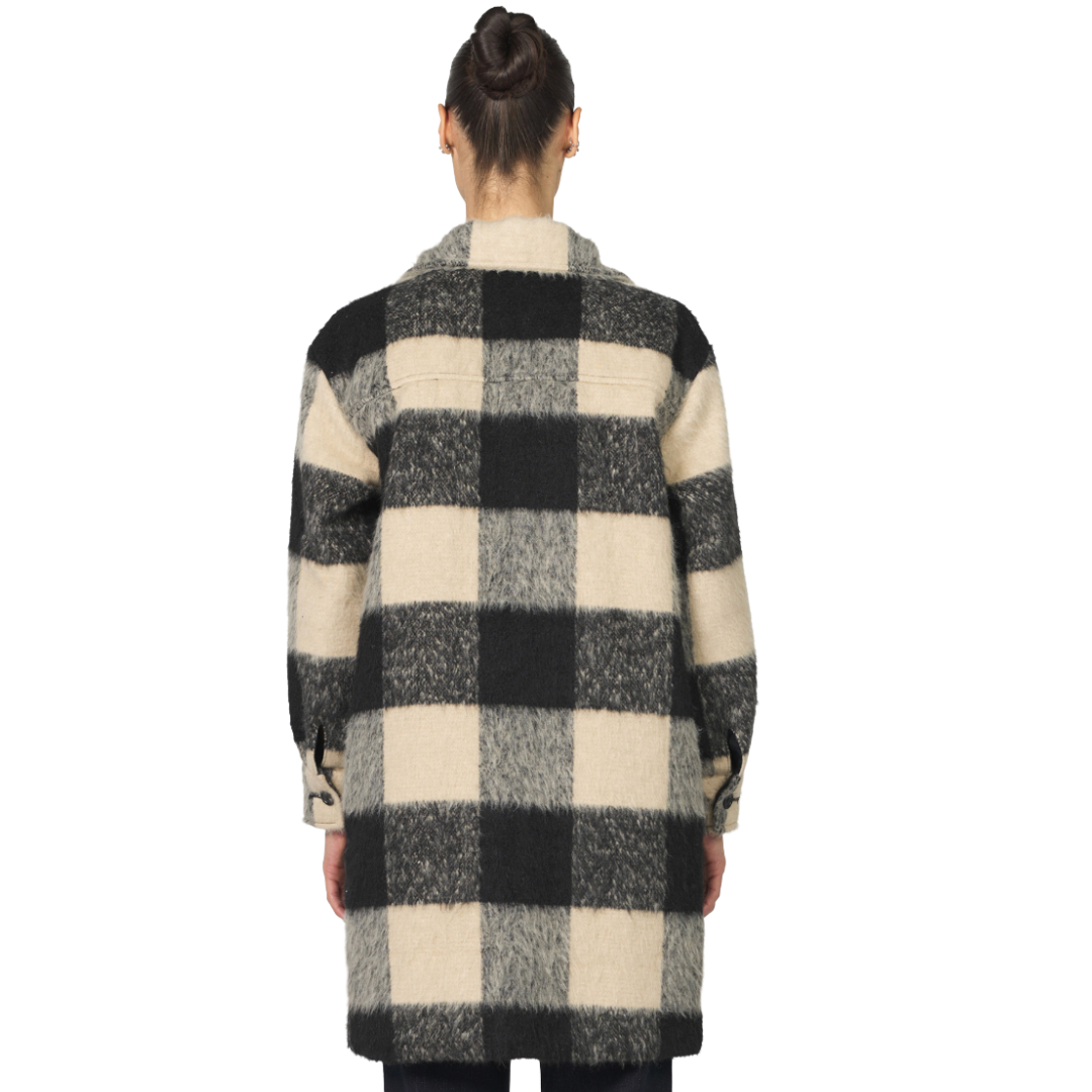 Step out in style with the Carmine Coat, featuring a playful black cream plaid pattern that adds a twist to classic elegance. Its button-front design and crisp collar offer a structured look, while the relaxed fit keeps you comfy and cool all day long. Perfect for layering or wearing solo, this coat brings cozy charm and effortless flair to your wardrobe.