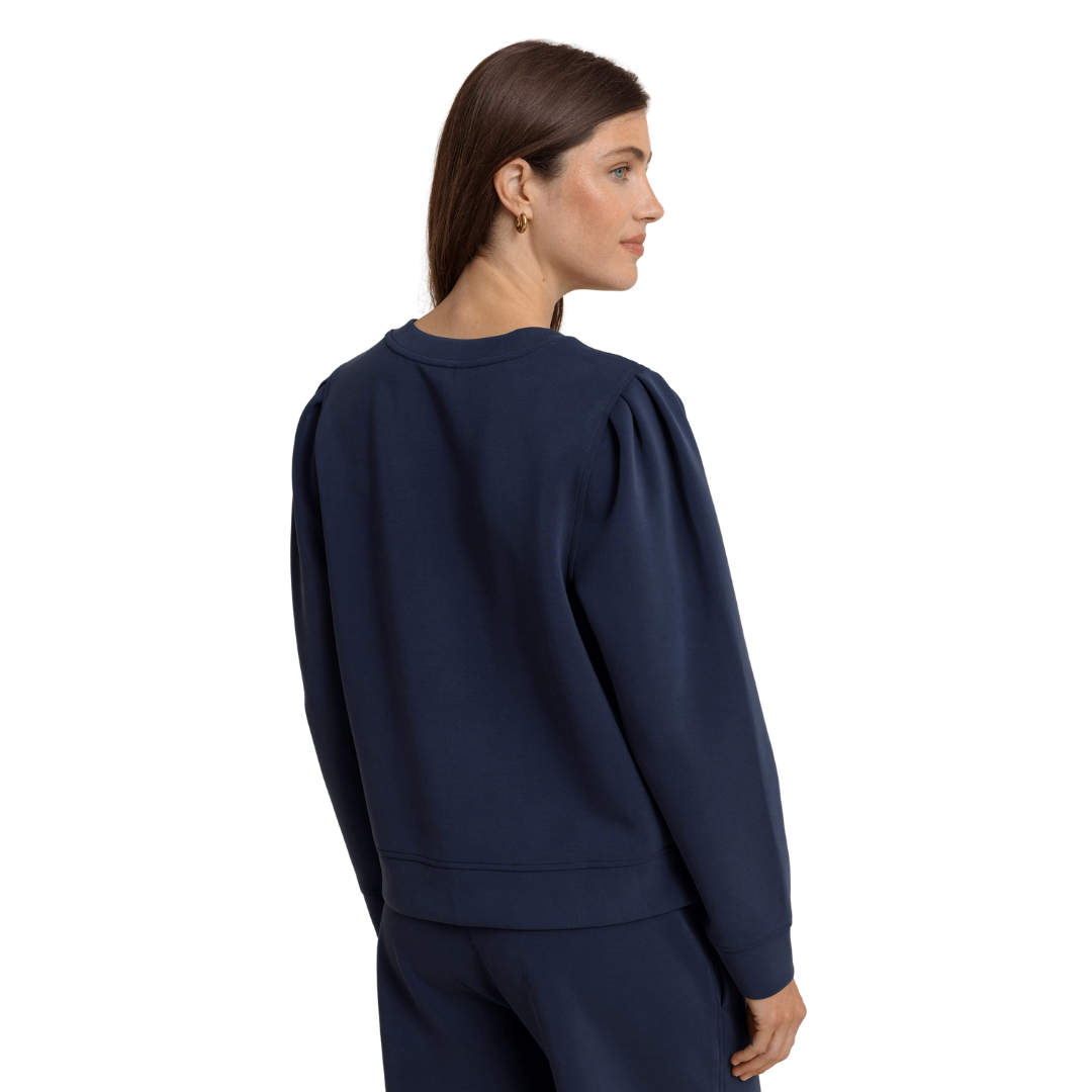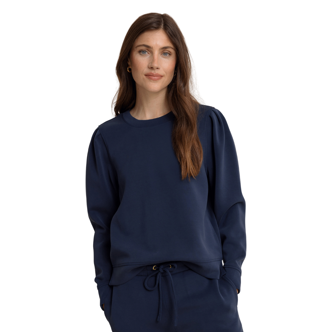 Slip into the Sara Lounge Pullover, crafted from a buttery soft blend of polyester, modal rayon, and a touch of spandex for stretch and comfort. Its relaxed fit and charming sleeve details with pleats add a playful flair to your cozy look. Perfectly paired with Levitt Lounge pants, this pullover is your go-to for lounging in style and ease.