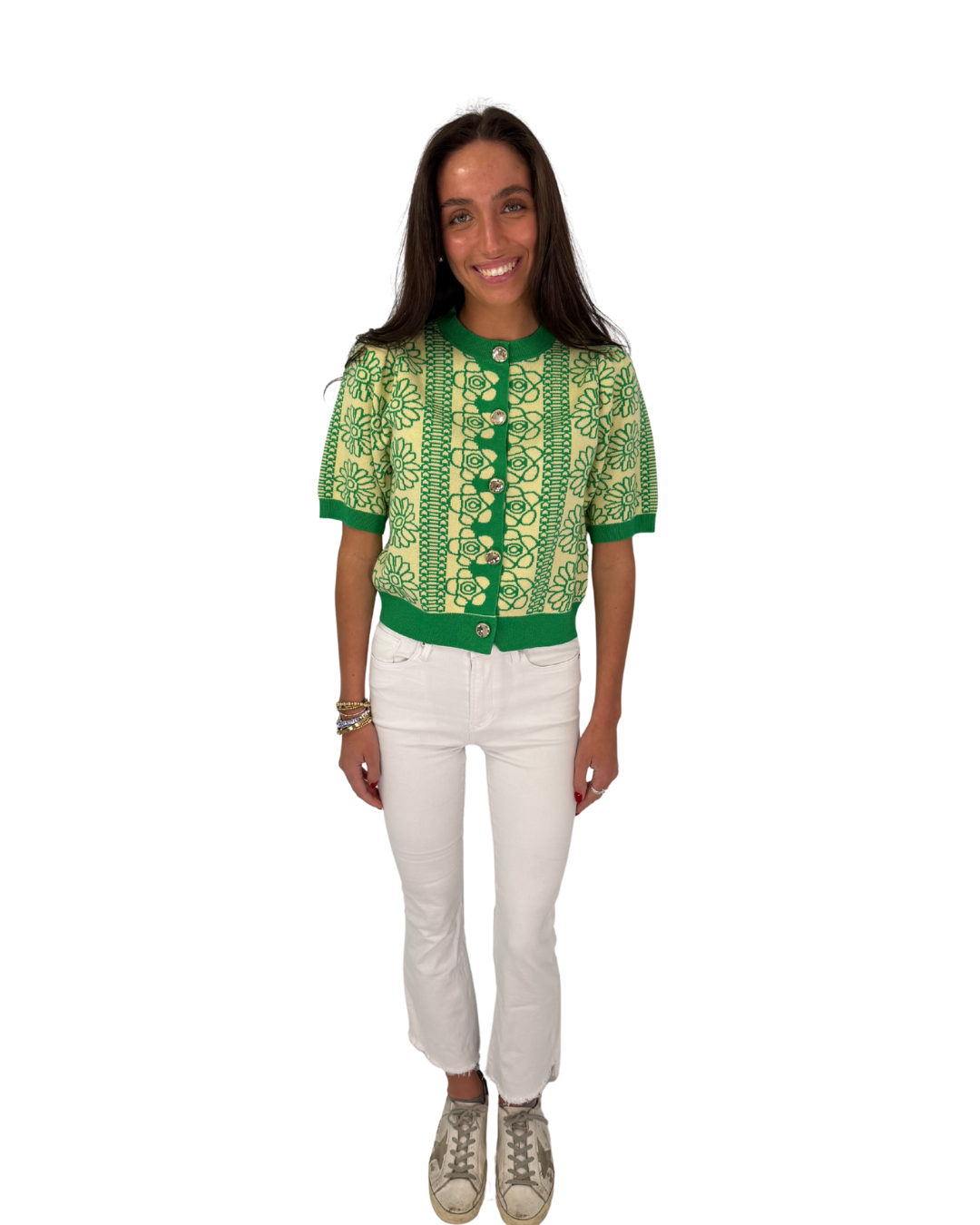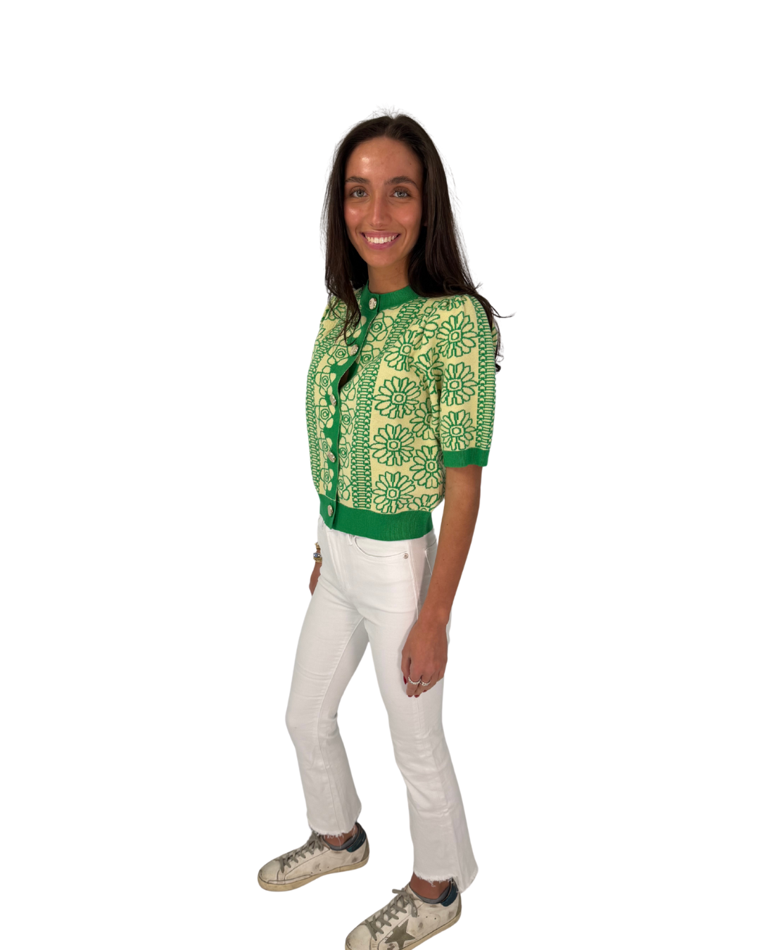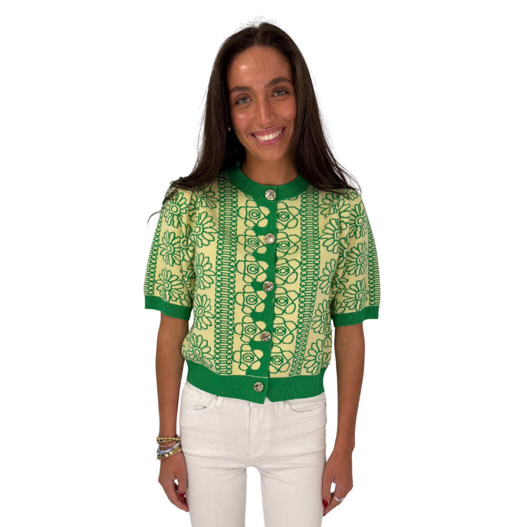 Celebrate the season in style with this charming short-sleeve button-up top featuring a festive green knit pattern perfect for St. Patrick's Day festivities. The playful floral design brings a touch of whimsy to your wardrobe, while the classic button-front silhouette keeps things timeless and versatile. Whether you're heading to a parade or a casual gathering, this cozy knit top pairs effortlessly with your favorite jeans or skirts for an outfit that's equal parts fun and put-together.