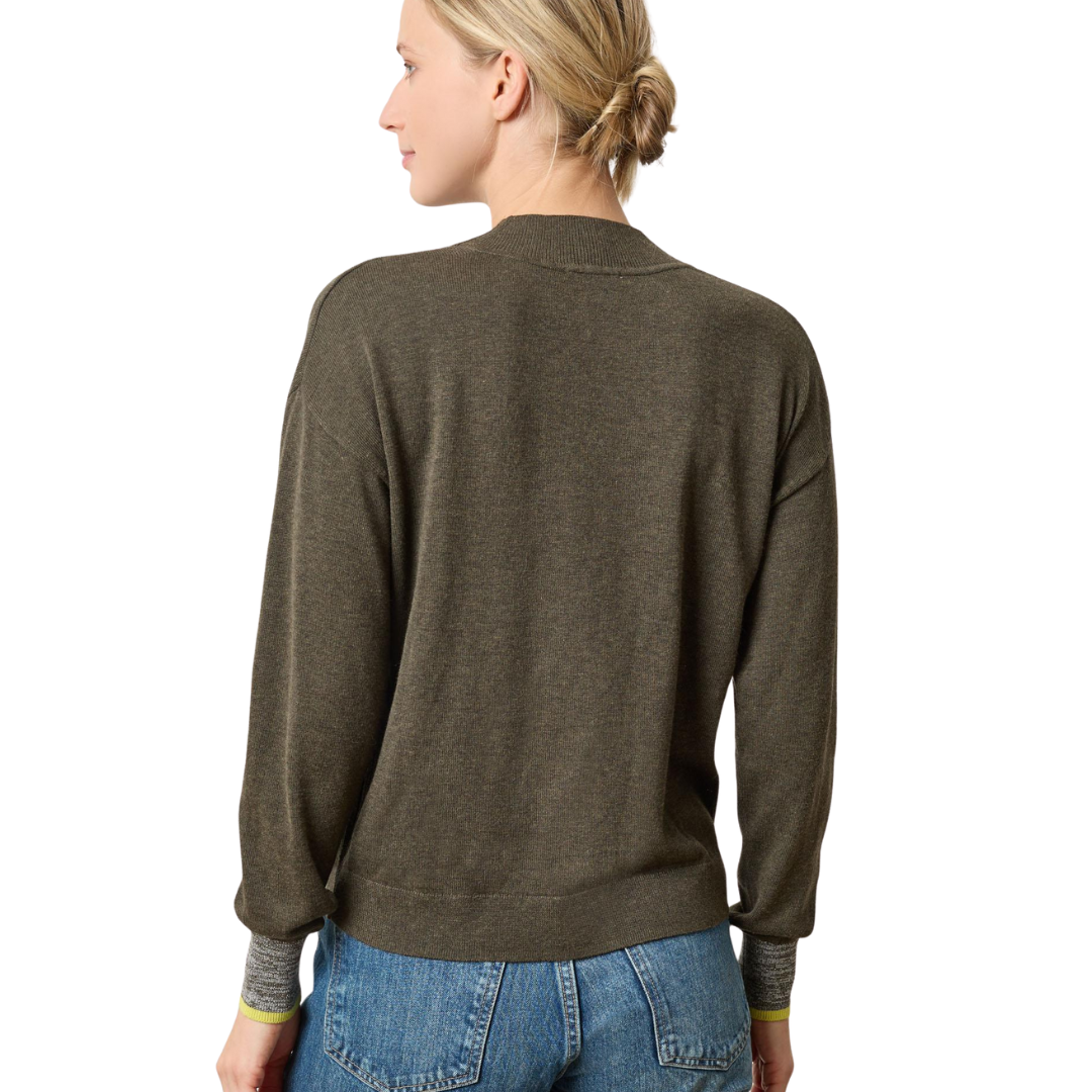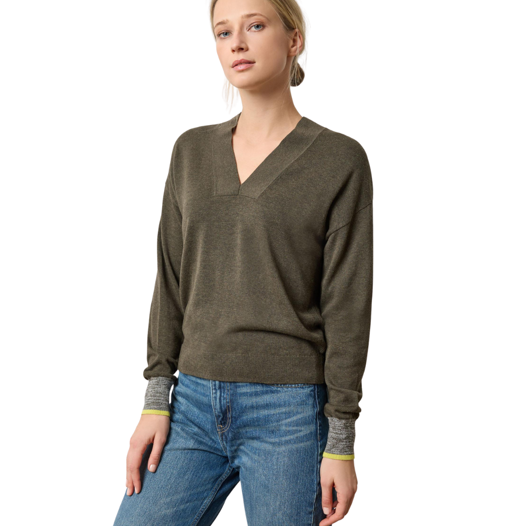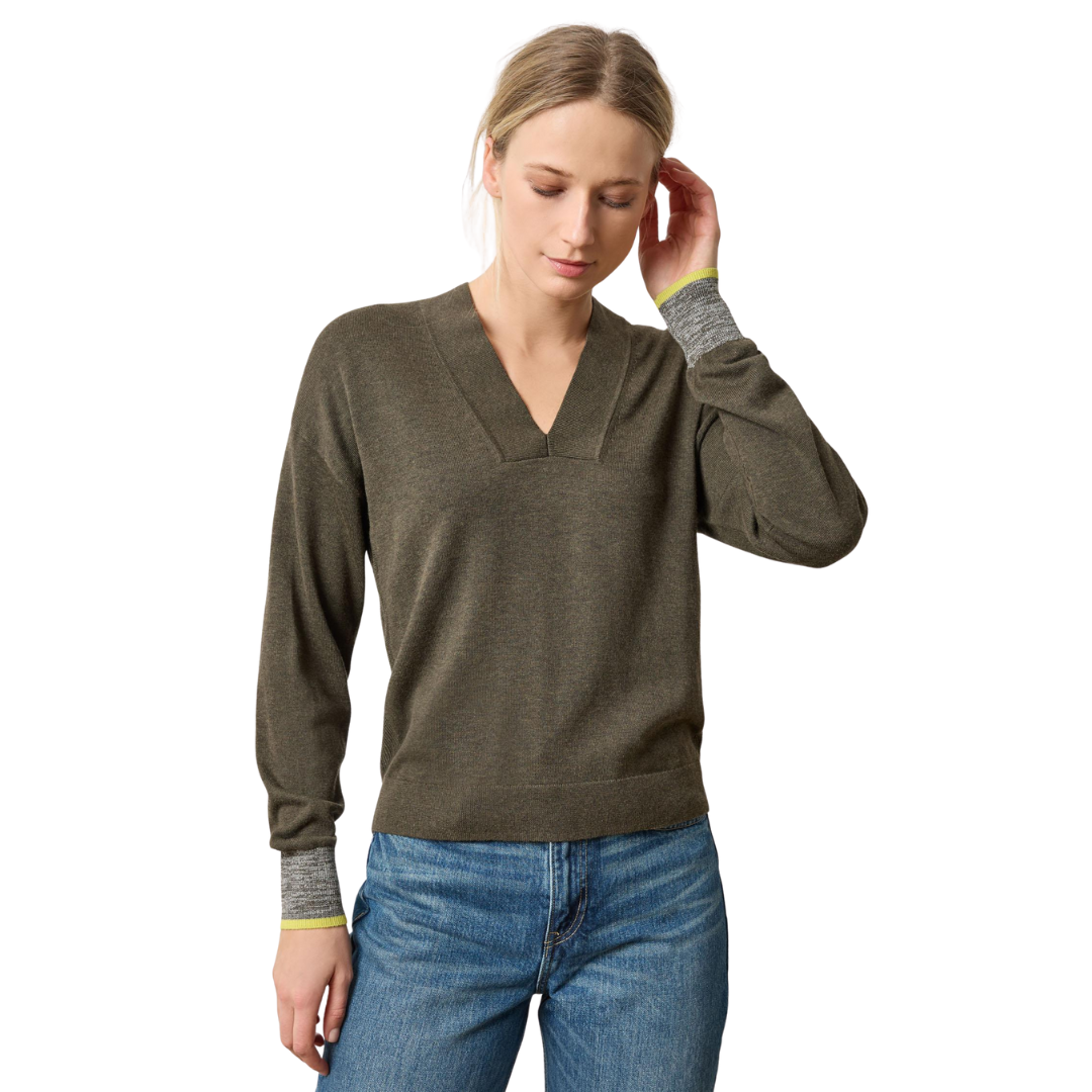 The V-Neck Pullover Sweater in our Cotton Modal blend yarn is a refined take on an effortless staple. Marled cuffs and contrast tipping at the sleeve openings add subtle detail, while the wide trim squared-off V-neckline brings a modern touch. Designed with dropped shoulders and a loose bottom opening, this style is relaxed yet polished, perfect for everyday wear.