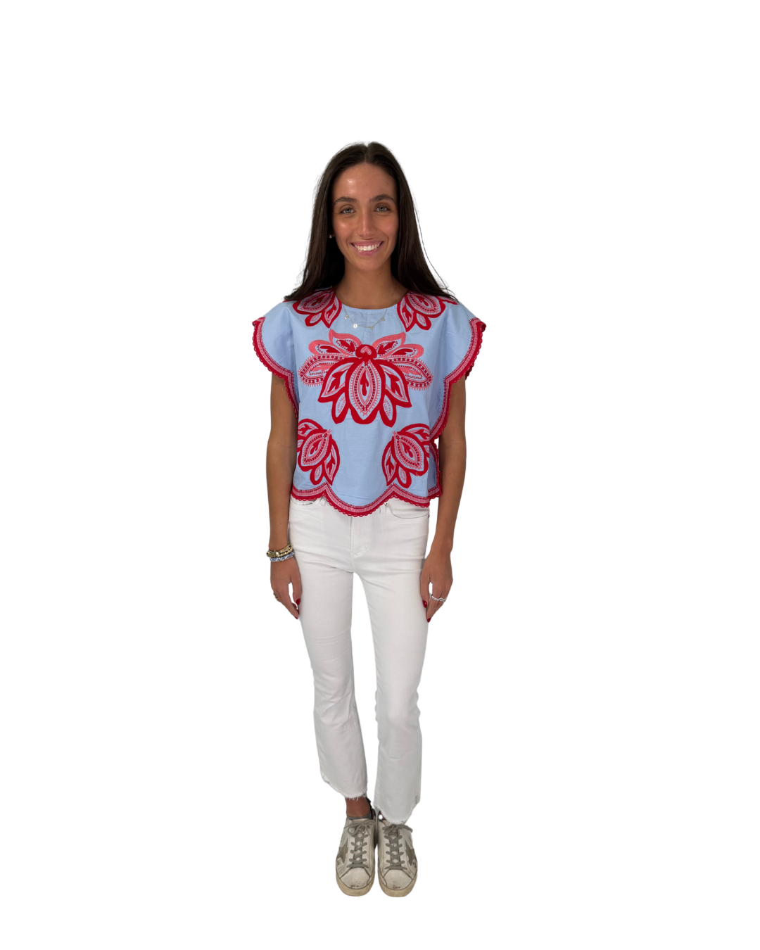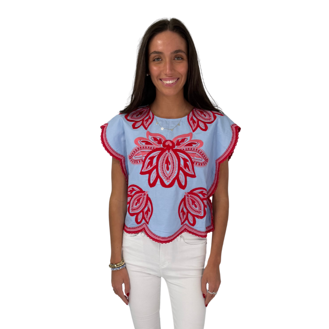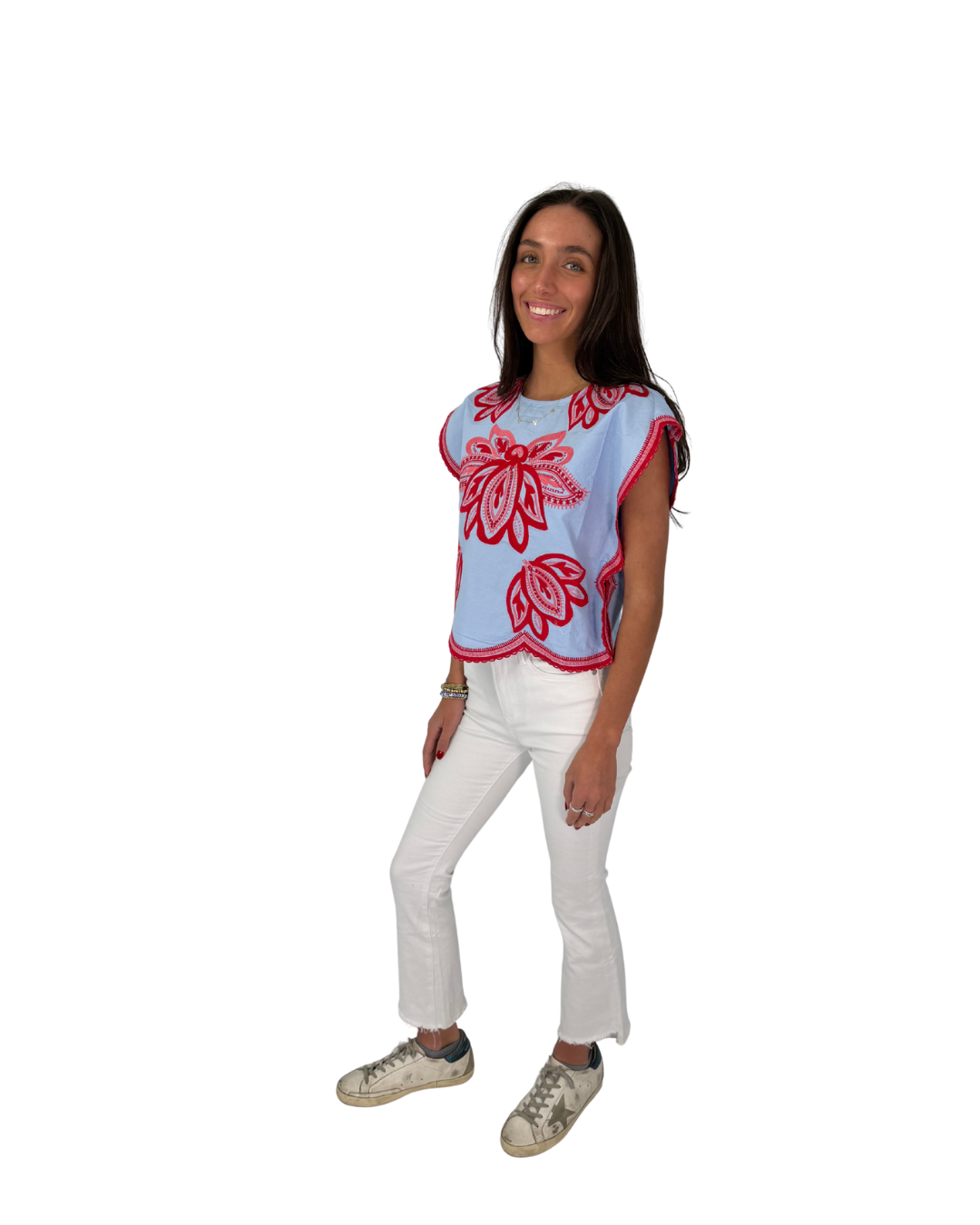 Brighten your spring break wardrobe with this adorable short sleeve top in soft baby blue, adorned with eye-catching red and pink embroidery accents. The playful design pairs beautifully with high-waisted jeans for a classic look or a flowing skirt for something more relaxed and fun. Whether you're heading to the beach, exploring a new city, or just enjoying warm weather vibes, this top delivers effortless style with personality. A versatile essential that works as hard as you do.