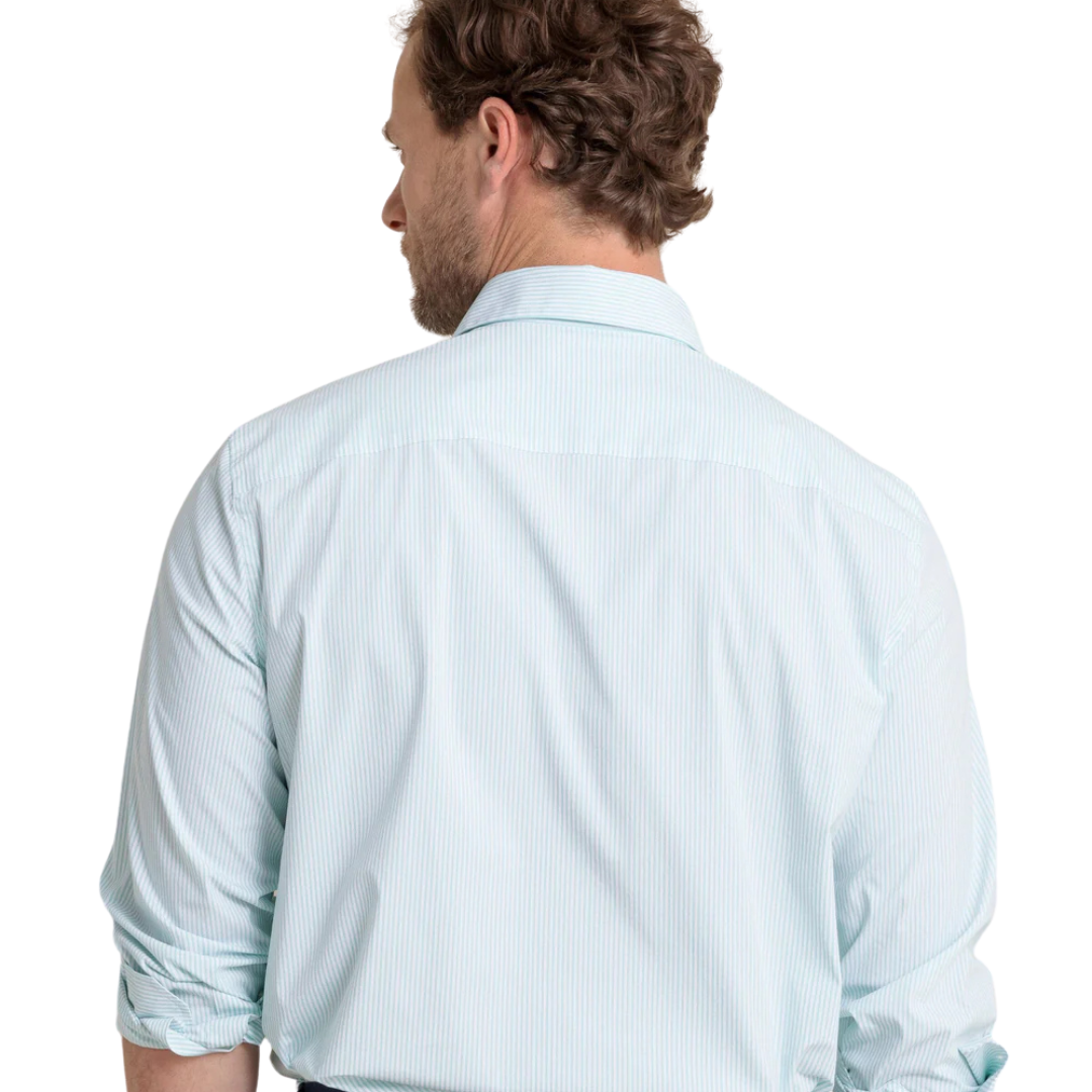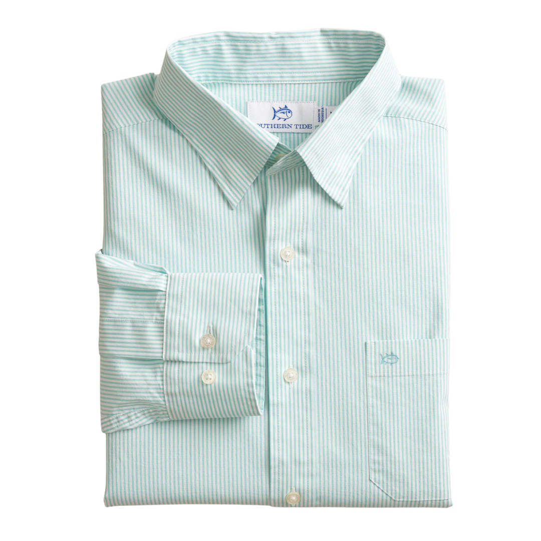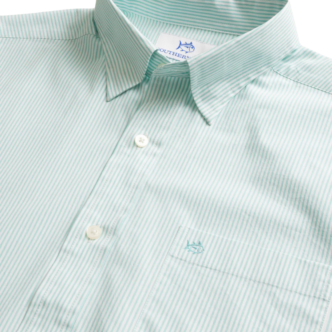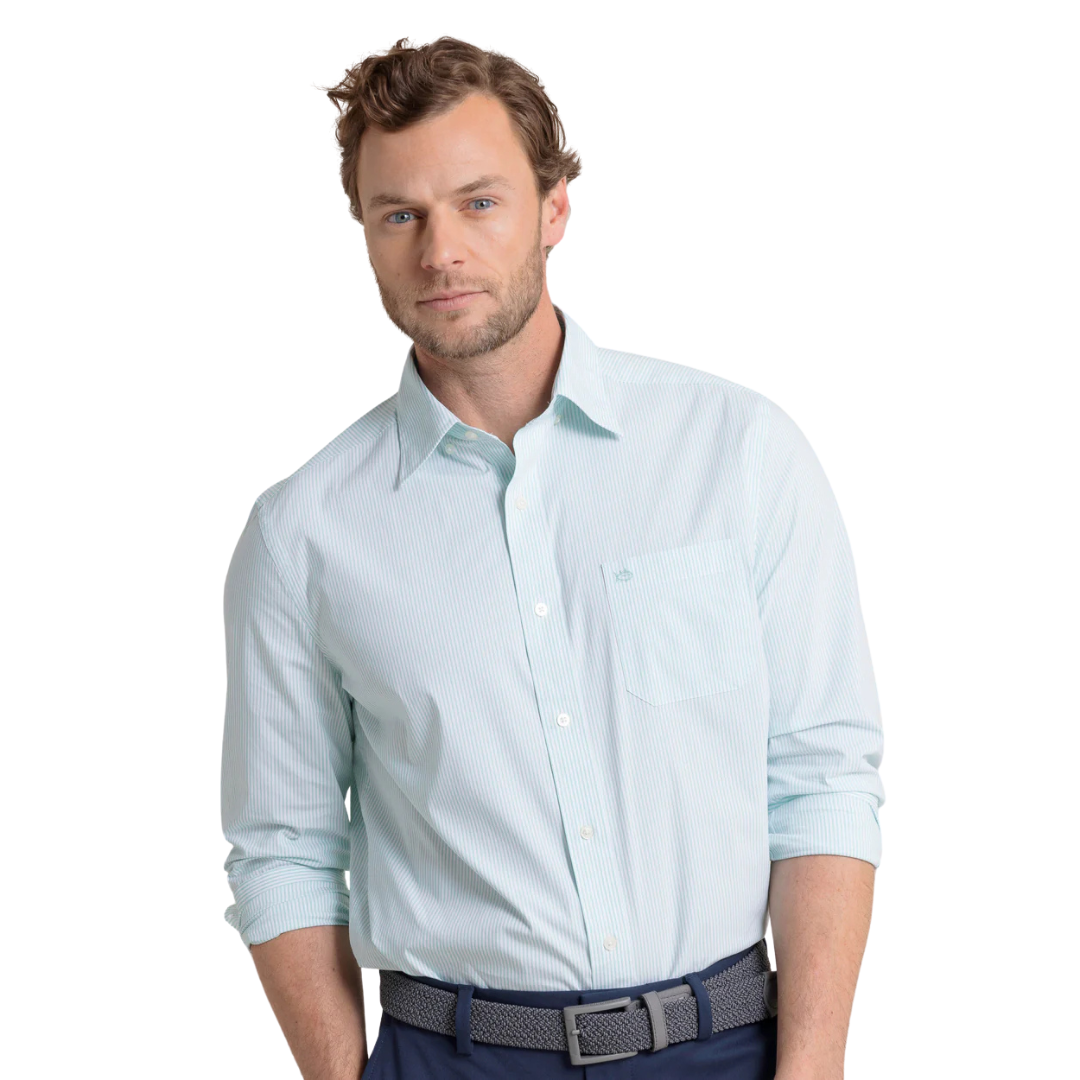 Earn your Southern stripes in this sport shirt. This beloved button-down is built for style and comfort, making you the epitome of timeless sophistication. Featuring a blue and white pinstripe pattern, this long-sleeve shirt is constructed from flexible, cooling materials.