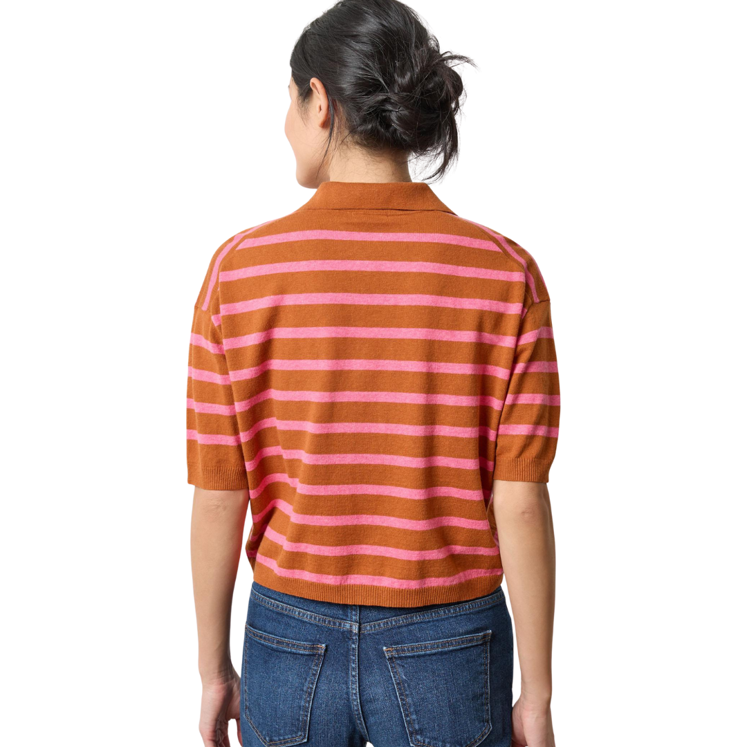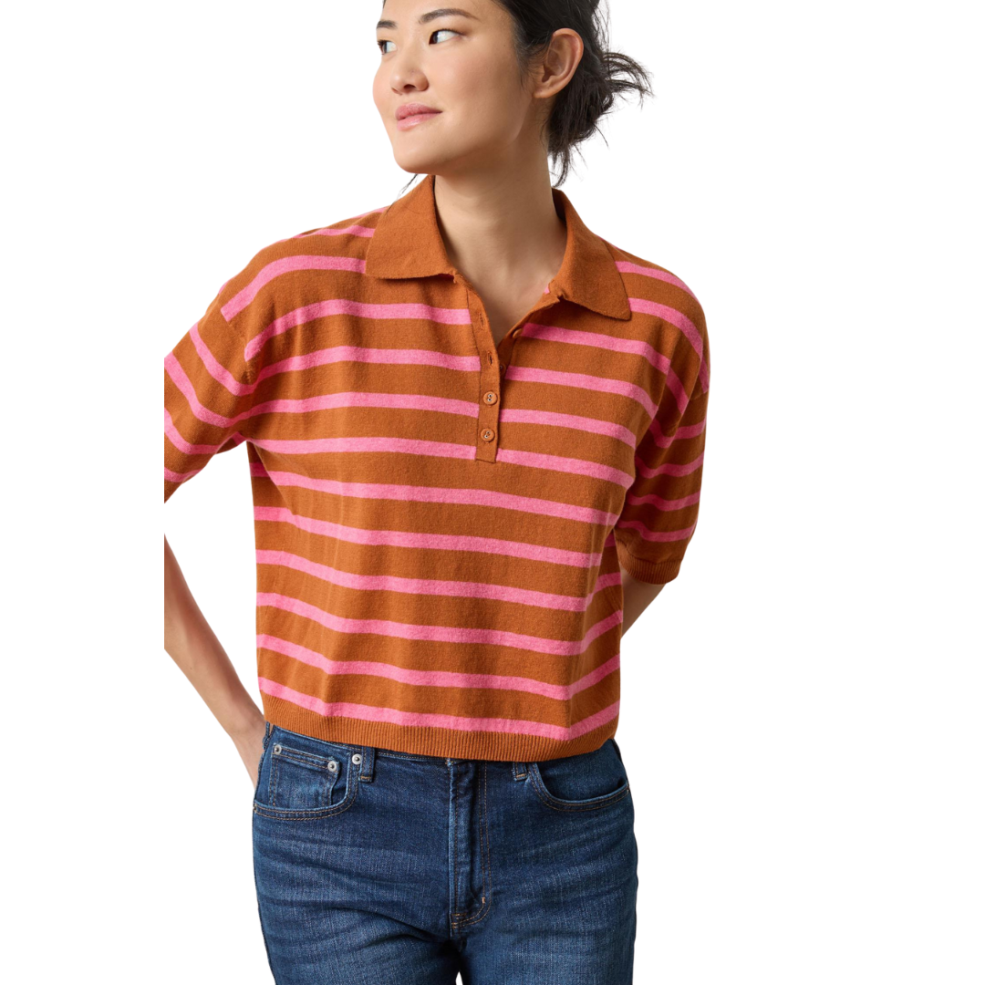 Our fine-gauge cotton blend is a lightweight yarn, perfect when you need just a bit more than a tee. The dropped shoulders, rounded body, and loose short sleeves create a relaxed fit, while the polo neckline with small buttons adds a delicate, on-trend touch. Available in solid or stripe, this sweater pairs beautifully with our twill pants or your favorite denim.