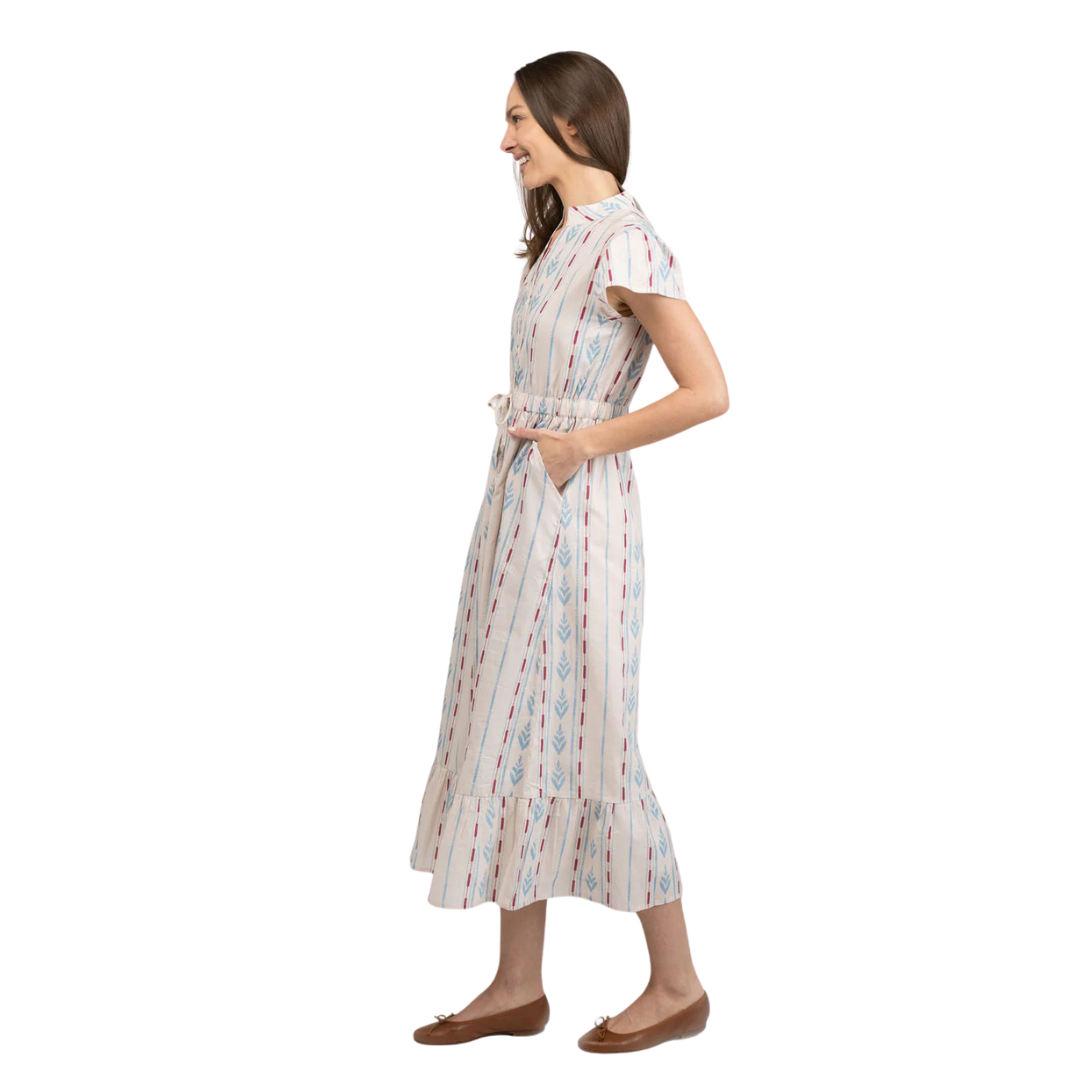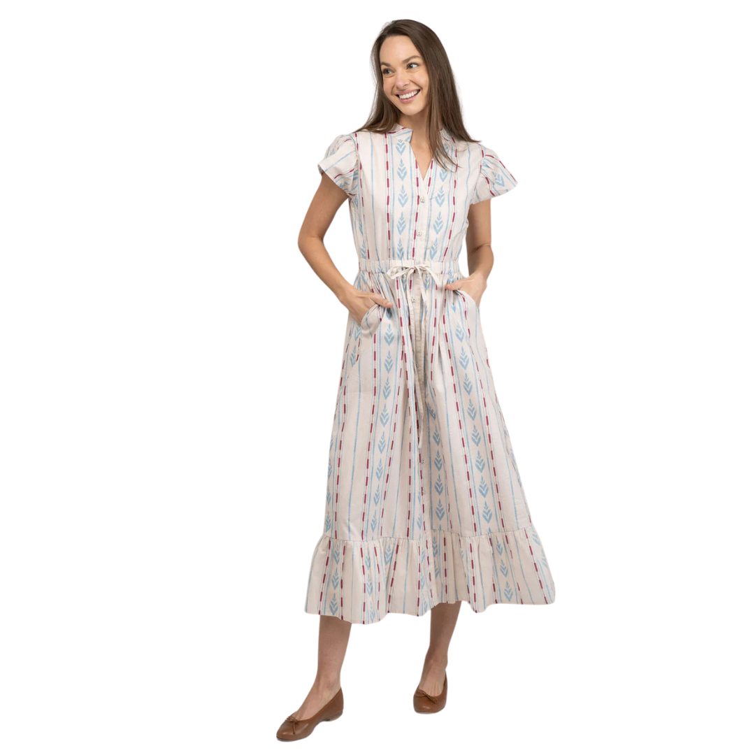 The Flutter Dress, the perfect dress for any season. This classic design features a button-up bodice, flutter sleeves, and an elastic waist tie and ruffle hem. And of course, pockets!