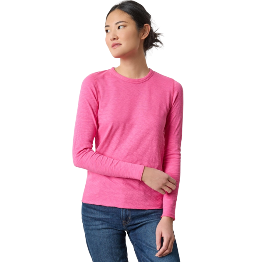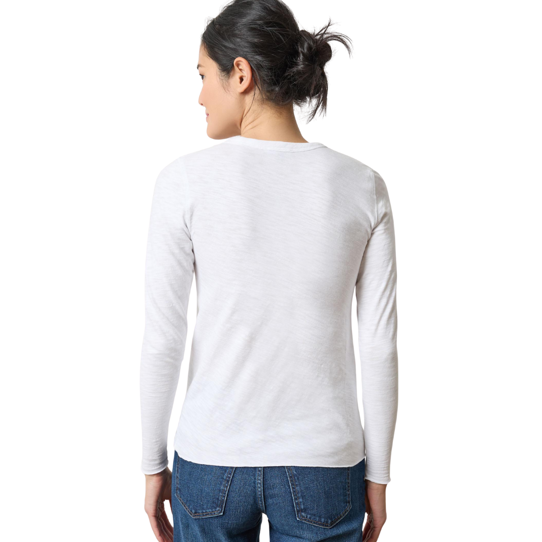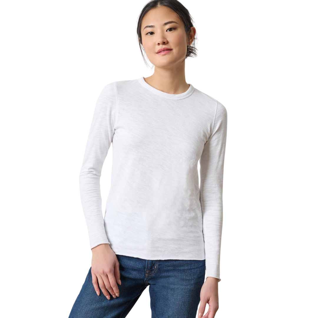 The Long Sleeve Bias Cut Crewneck in our mid-weight cotton slub is a fresh take on a classic crewneck. The body and rib trim at the neckline are cut on the bias, creating a flattering fit that gently hugs the body. Merrow edges at the hem and sleeve openings add a subtle, undone touch for a look that feels effortless and modern.