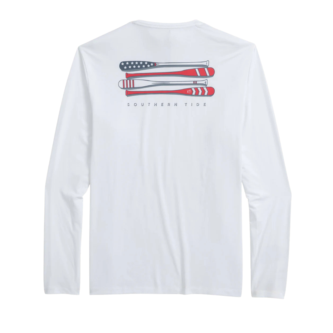 This long-sleeve performance tee delivers a bold red, white, and blue style with a sleek self-collar. Built for all-day comfort, UV protection, and whatever summer throws your way — grilling, casting a line, or catching fireworks.
