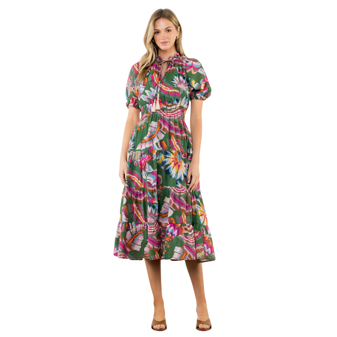 Embrace fall with the Puff Sleeve Print Tiered Maxi Dress, featuring a vibrant green background adorned with pink, blue, orange, and brown floral patterns. Its tiered design and puff sleeves offer a flattering silhouette, combining comfort with seasonal style. This maxi dress brings expert-crafted elegance to your autumn wardrobe.